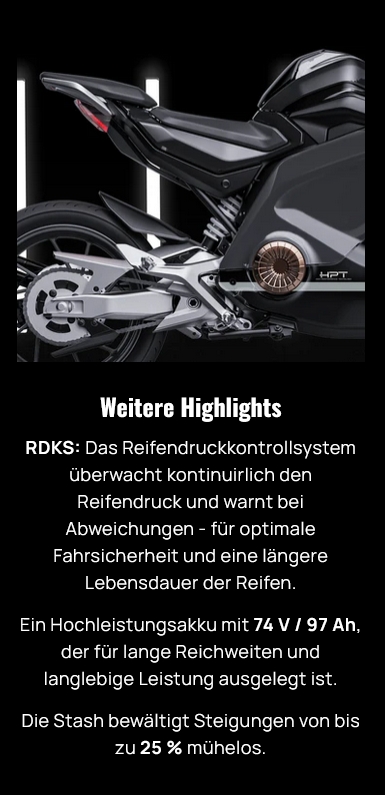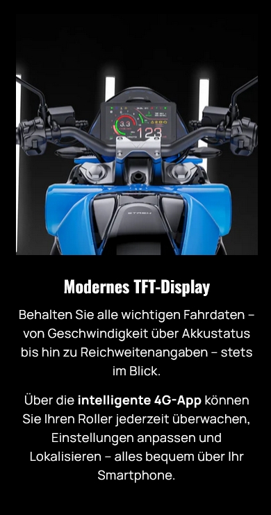 Mit einer Höchstgeschwindigkeit von 120 km/h, ABS-Bremssystem, 4G-App-Konnektivität und einem innovativen TFT-Display bietet dieses Elektromotorrad alles, was das Herz von Pendlern und Performance-Liebhabern höherschlagen lässt.