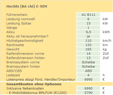 110 km/h Spitze, ein gekapselter Riemenantrieb, die Akku sind herausnehmbar.
