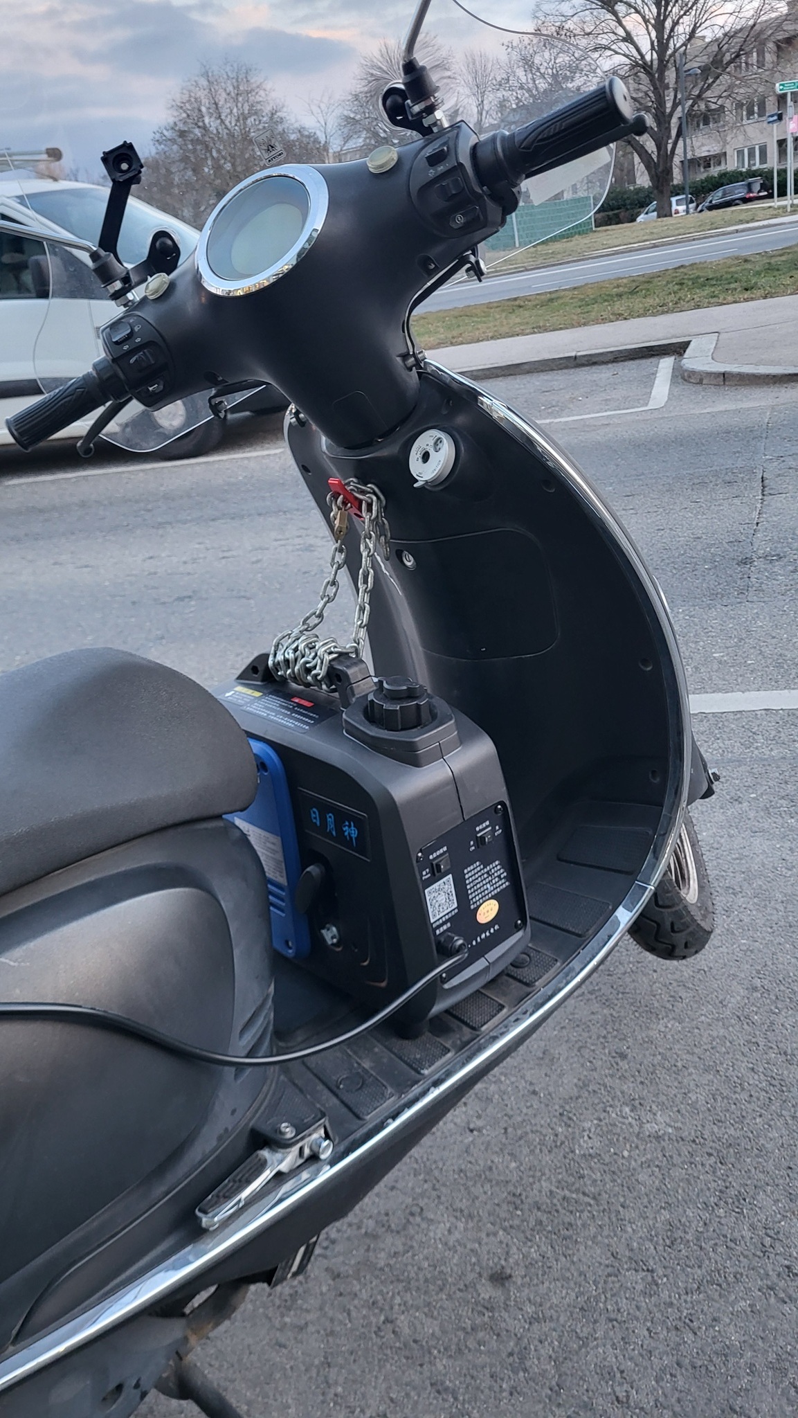 Egon hat eine sehr kreative Range Extender Lösung! Ein Aggregat (etwas laut und nicht so ganz emissionsfrei) liefert 10 Ampere Ladestrom.