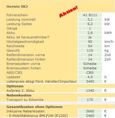 Damit der Käufer diese Förderung durch die Umweltförderung in Anspruch nehmen kann, gewährt der Händler / Importeur (Bikemite) ebenso eine weitere Förderung in der Höhe von €350 (L1e) bzw €500 (L3e) netto.